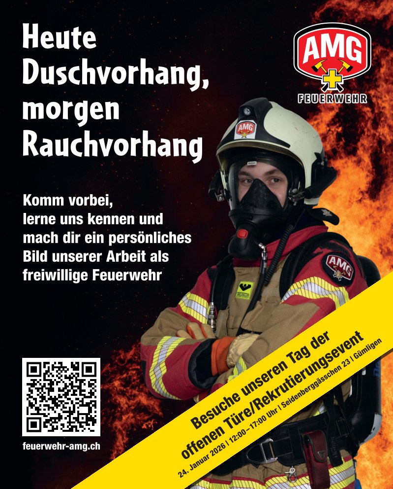 und laden euch herzlich ein, uns am Samstag, dem 24. Januar 2026 im Magazin im Seidenberggässchen 23 in Gümligen zu besuchen. Ihr braucht euch nicht anzumelden, spaziert einfach zwischen 12:00 und 17:00 Uhr bei uns herein. Gerne führen wir euch herum, könnt ihr unsere Fahrzeuge und Maschinen bestaunen und anfassen, und fragen, was ihr schon immer über die Feuerwehr wissen wolltet. Für interessierte Einsteiger gibt es ausführliche Infoposten, die keine Fakten aussen vor lassen. Wir freuen uns auf zahlreiche Besucherinnen und Besucher.